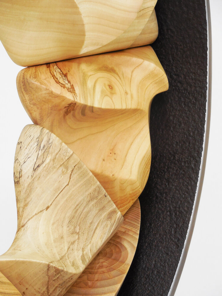 Die Komposition besteht ausschließlich aus recycelten Materialien – sie ist ganz im Geiste des Upcyclings entstanden. Die Holzelemente – Nussbaum, Pfirsich, Esche und Holunder – wurden allesamt aus Brennholz gerettet. Die Metallteile stammen von einem Schrottplatz, denen ich eine neue Form gegeben habe. Ich habe den weggeworfenen Stücken neues Leben eingehaucht – so wie Achtsamkeit neues Leben in einen vergessenen Menschen bringen kann.